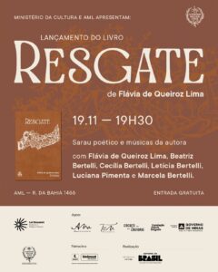 A Academia Mineira de Letras recebe, no dia 19 de novembro, às 19h30, o sarau de lançamento do livro Resgate, com o qual Flávia de Queiroz Lima comemora a chegada de seus 80 anos. Juntamente com a autora, suas netas Beatriz e Cecília Bertelli, além da filha Letícia Bertelli e de Luciana Pimenta,que participa do livro num ensaio sobre a obra poética de Flávia, farão leituras de poemas e apresentação de cartas que integram Resgate. O encontro, com entrada gratuita e aberto ao público, contará ainda com a participação de Marcela Bertelli, também filha da autora, na apresentação de três chorinhos que “resgatam” a atuação de Flávia como compositora, desde a década de 1960, no Rio de Janeiro. O evento de lançamento é gratuito e aberto ao público.
