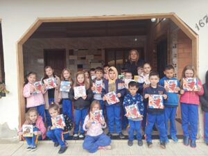 Hoje, os alunos do primeiro ano da Escola Municipal Pe. Heriberto Hartmann estiveram aqui em casa, com a professora Luciana Rech.