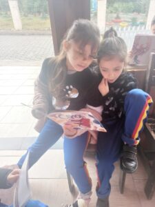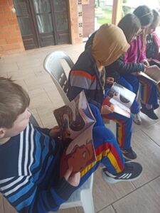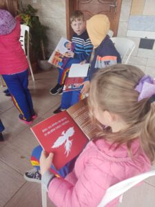 O espaço improvisado não impediu das crianças ficarem a vontade. Fizeram muitas perguntas interessantes e ouviram com atenção.