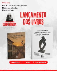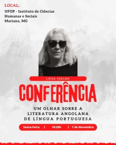 A professora Luísa Coelho profere a Conferência “Um olhar sobre a literatura angolana de língua portuguesa” no Instituto de Ciências Humanas e Sociais da UFOP, em Mariana, MG, no dia 7 de novembro, às 10h20. Na sequência, faz o lançamento de livro com o mesmo título da conferência; na ocasião, também será lançada a coletânea “Minas Gerais: contos e confidências”.