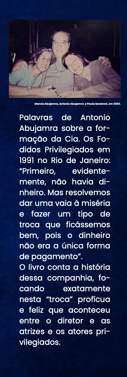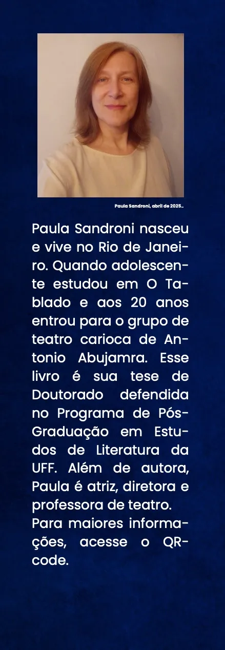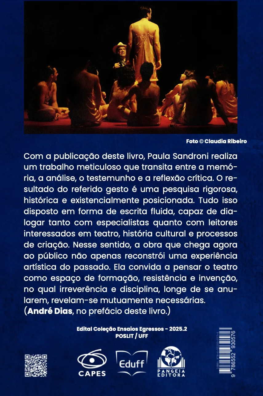 Com a publicação deste livro, Paula Sandroni realiza um trabalho meticuloso que transita entre a memória, a análise, o testemunho e a reflexão crítica. O resultado do referido gesto é uma pesquisa rigorosa, histórica e existencialmente posicionada. Tudo isso disposto em forma de escrita fluida, capaz de dialogar tanto com especialistas quanto com leitores interessados em teatro, história cultural e processos de criação. Nesse sentido, a obra que chega agora ao público não apenas reconstrói uma experiência artística do passado. Ela convida a pensar o teatro como espaço de formação, resistência e invenção, no qual irreverência e disciplina, longe de se anularem, revelam-se mutuamente necessárias. (André Dias, Coordenador do POSLIT / UFF).