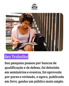 A sua pesquisa passou por bancas de qualificação e de defesa, foi debatida em seminários e eventos, foi aprovada por pares e revisada, e agora, ao ser publicada em livro, ganha um público mais amplo. A sua pesquisa merece destaque e vai se tornar uma obra magnífica, que alavancará a sua carreira no seu trabalho, com reconhecimento interno, e vai lhe projetar em novos espaços e em novos concursos.