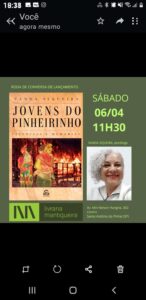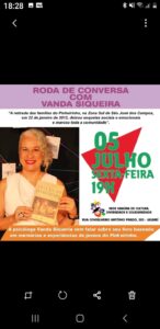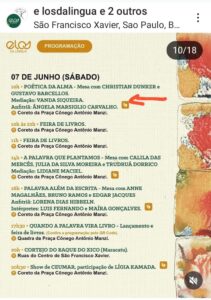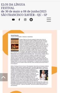 Vanda Siqueira, autora do livro Jovens do Pinheirinho: vivências e memórias, já em 2a. reimpressão, participa, nos dias 7 e 8 de junho, do ELOS DA LÍNGUA FESTIVAL, em São Francisco Xavier, SP. O evento tem início em 30/05 e vai até 07/06. Vanda estará presente todos os dias. No dia 7/6, ela lança o livro e faz mediação de  mesa com os psicanalistas e escritores Christian Dunker e Gustavo Barcelos.