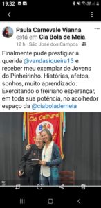 Lançado há um ano, Jovens do Pinheirinho: vivências e memórias, sempre levado pela autora, Vanda Siqueira, já participou de mais de uma dezena de eventos. Eis uma lista de eventos em que o livro foi lançado e esteve em debate, seguido por fotos desses momentos: